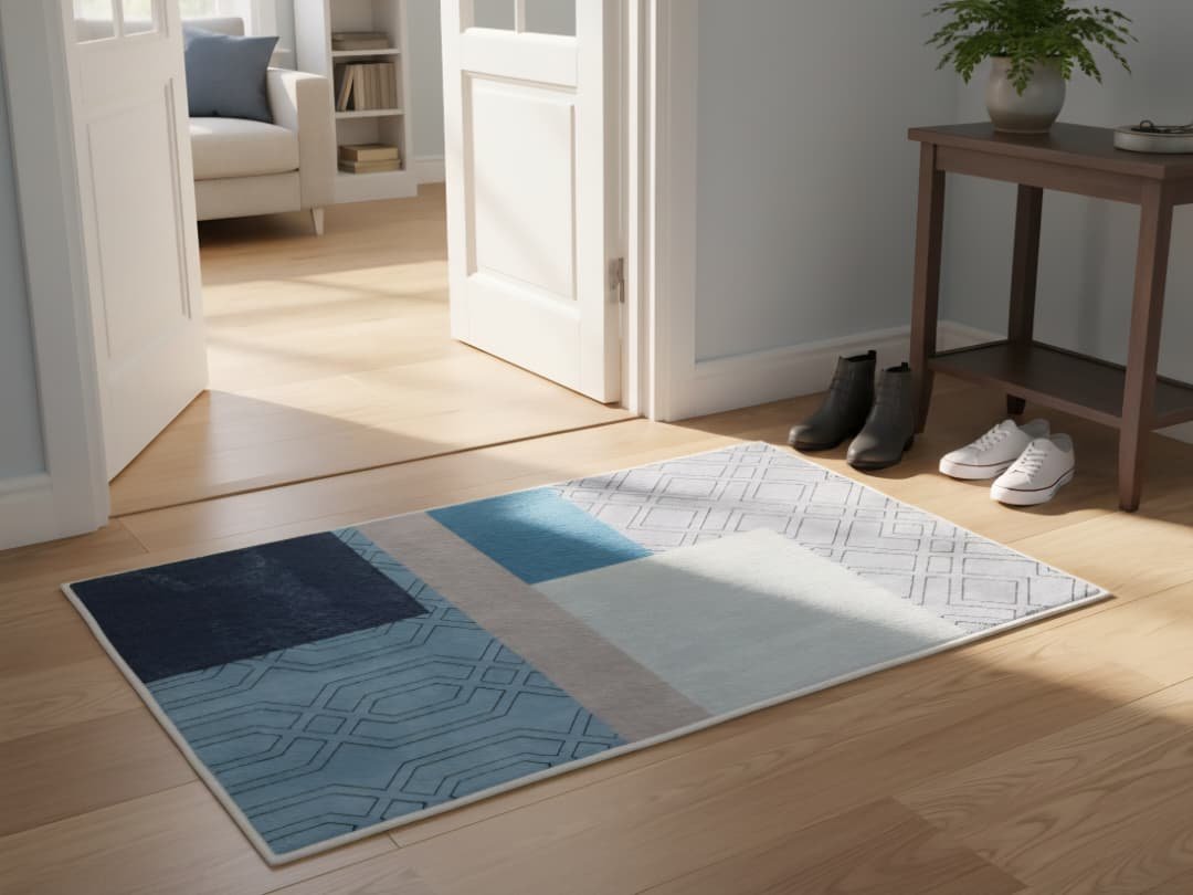 sdAlfombra con diseño abstracto con patrones geométricos en tonos azules y grises.xc