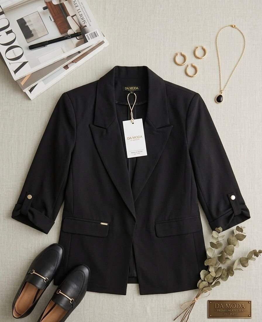 Blazer negro con diseño estructurado con solapas de pico, mangas tres cuartos con detalles de botones dorados y bolsillos con solapa.