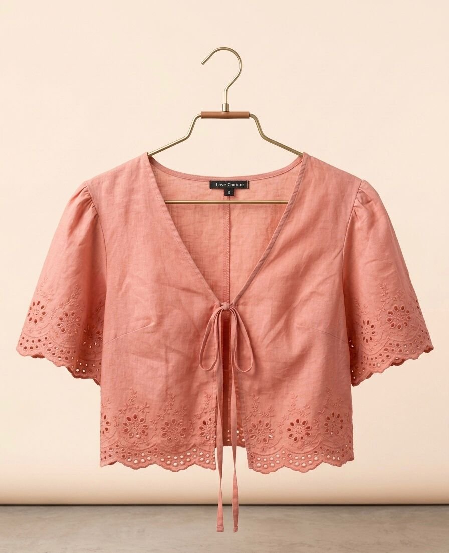 / Blusa corta de lino rosa con bordado inglés de la marca Love Couture.