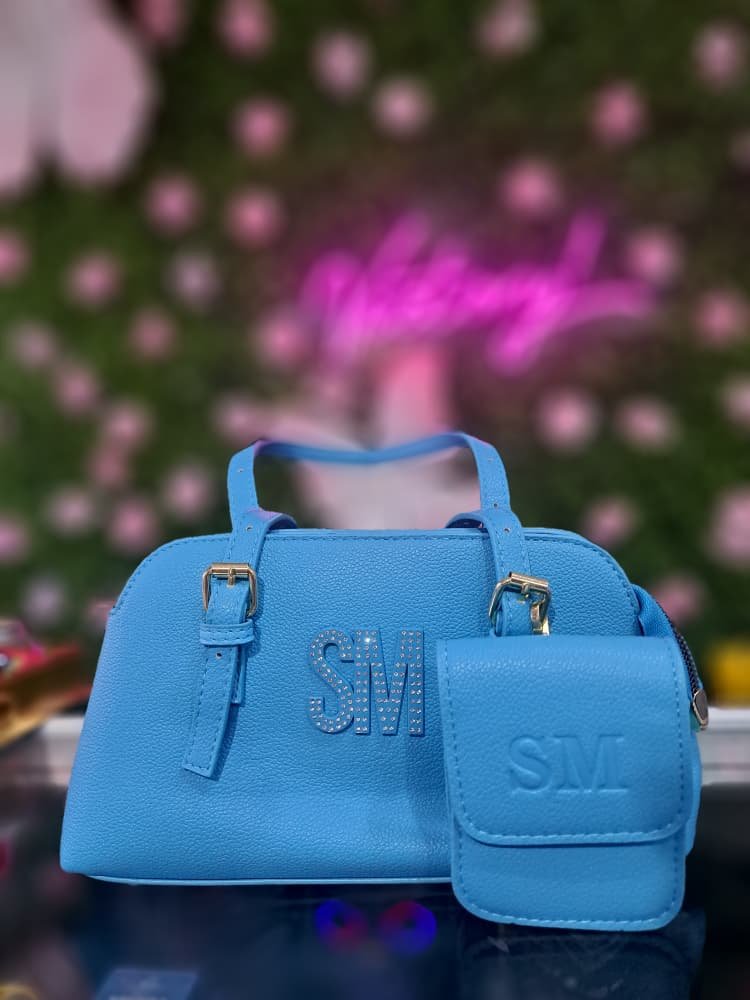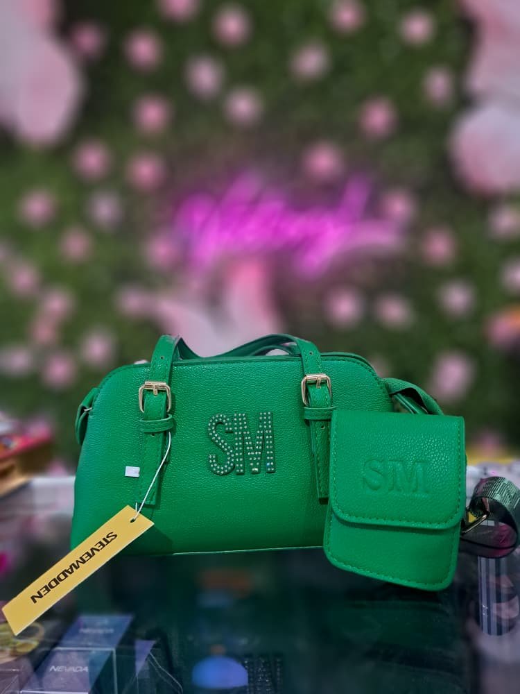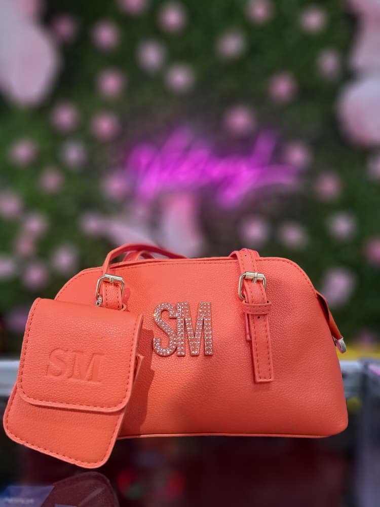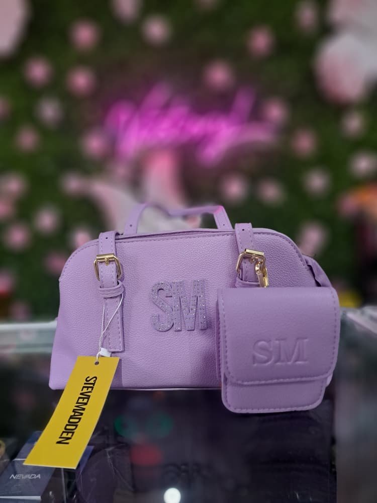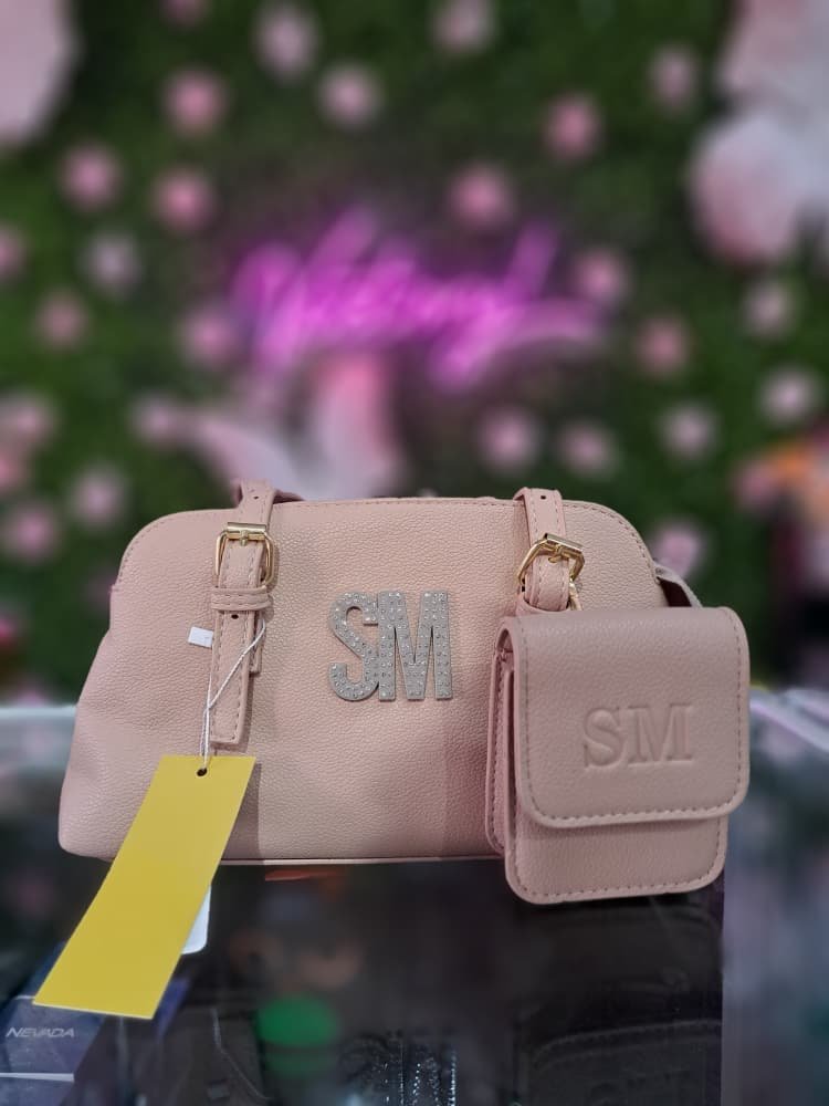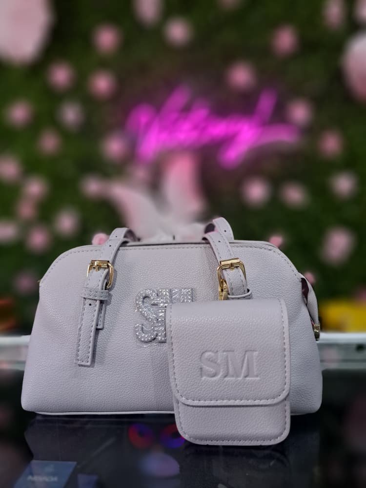 Cartera de mujer con diseño de rayas verticales y detalles de cuero.