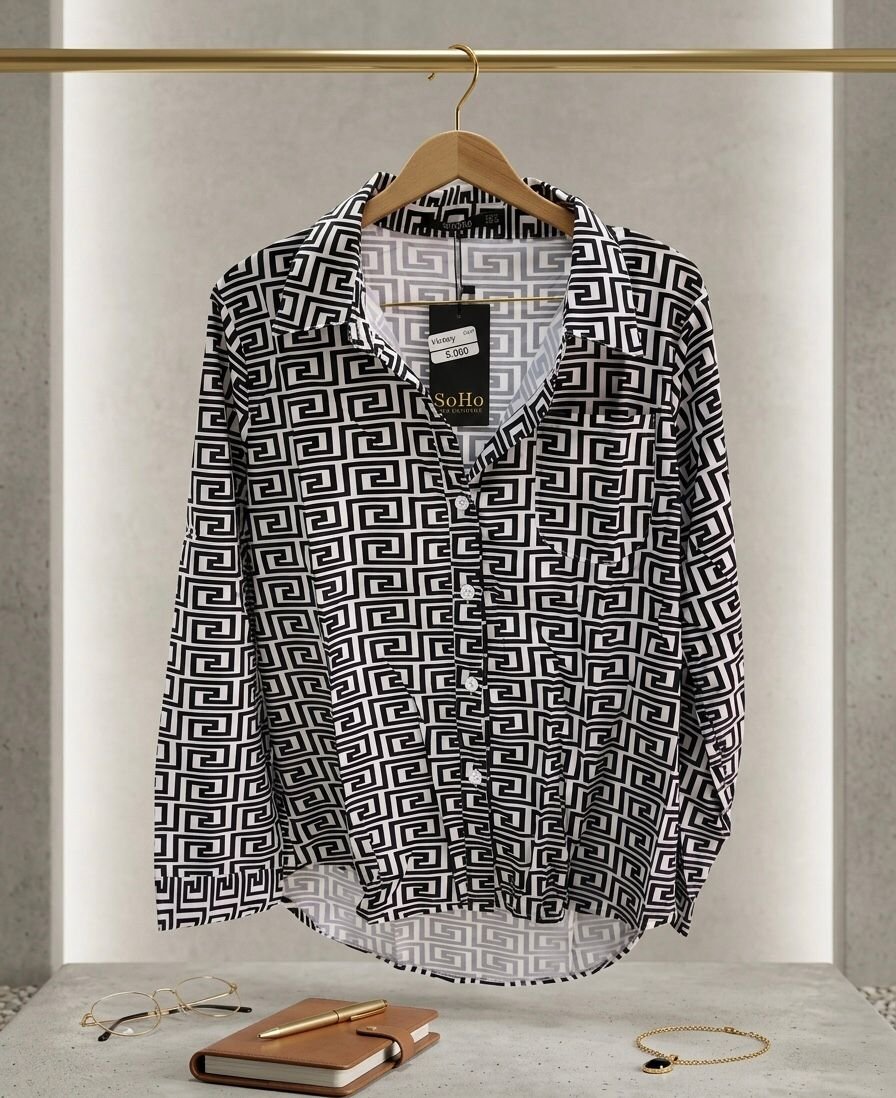 sdCamisa de botones para mujer con estampado geométrico en blanco y negro.xc