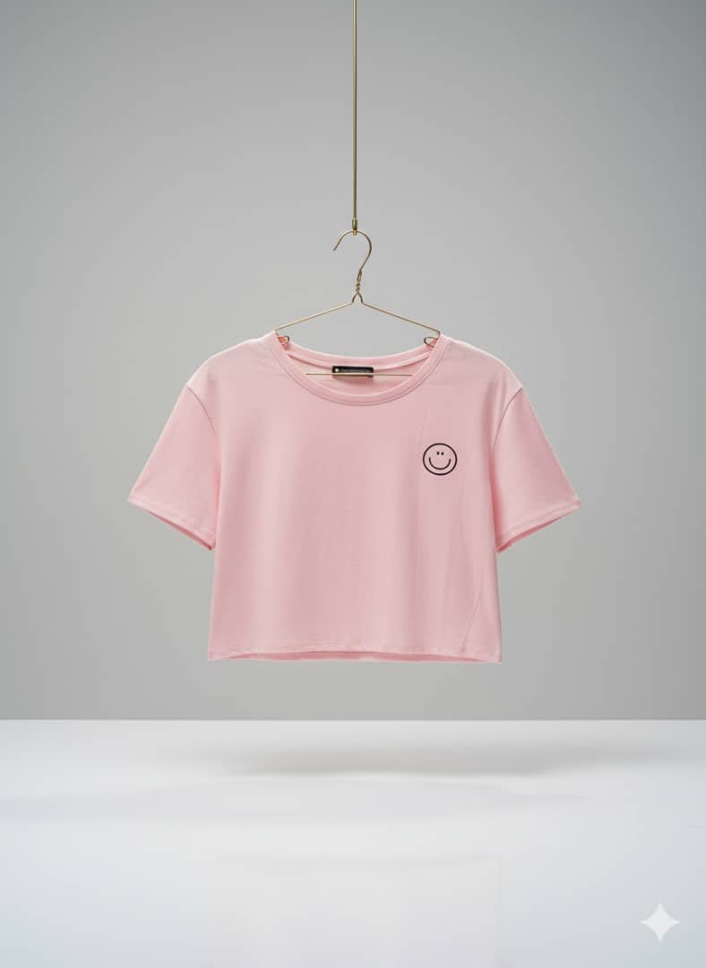 / Camiseta corta de color rosa con un pequeño diseño de carita feliz bordado en el pecho.
