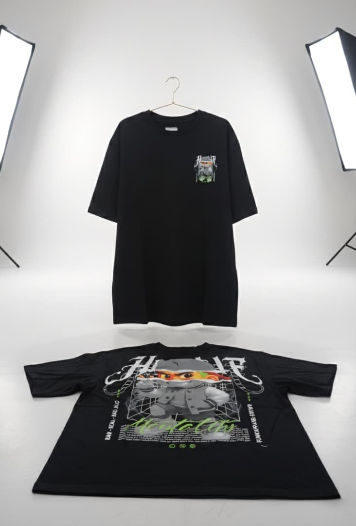 / Camiseta negra con estampado gráfico en el pecho y un diseño más grande en la parte trasera.