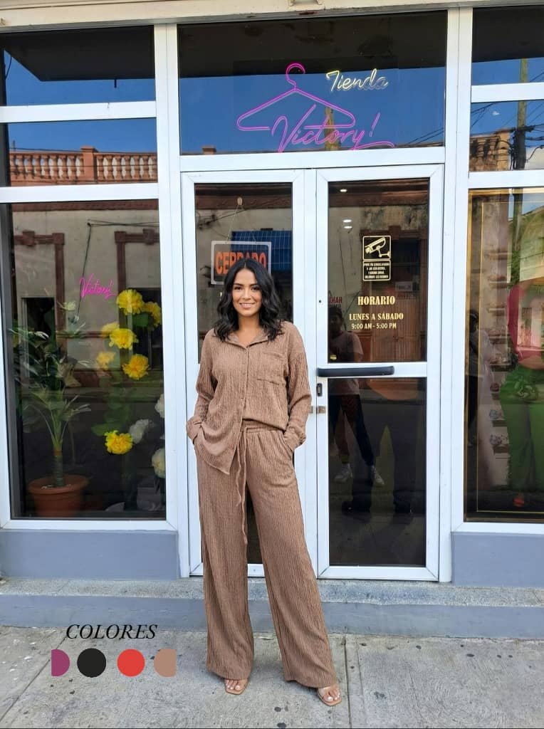 Conjunto de ropa de estar por casa con camisa plisada arrugada y botones