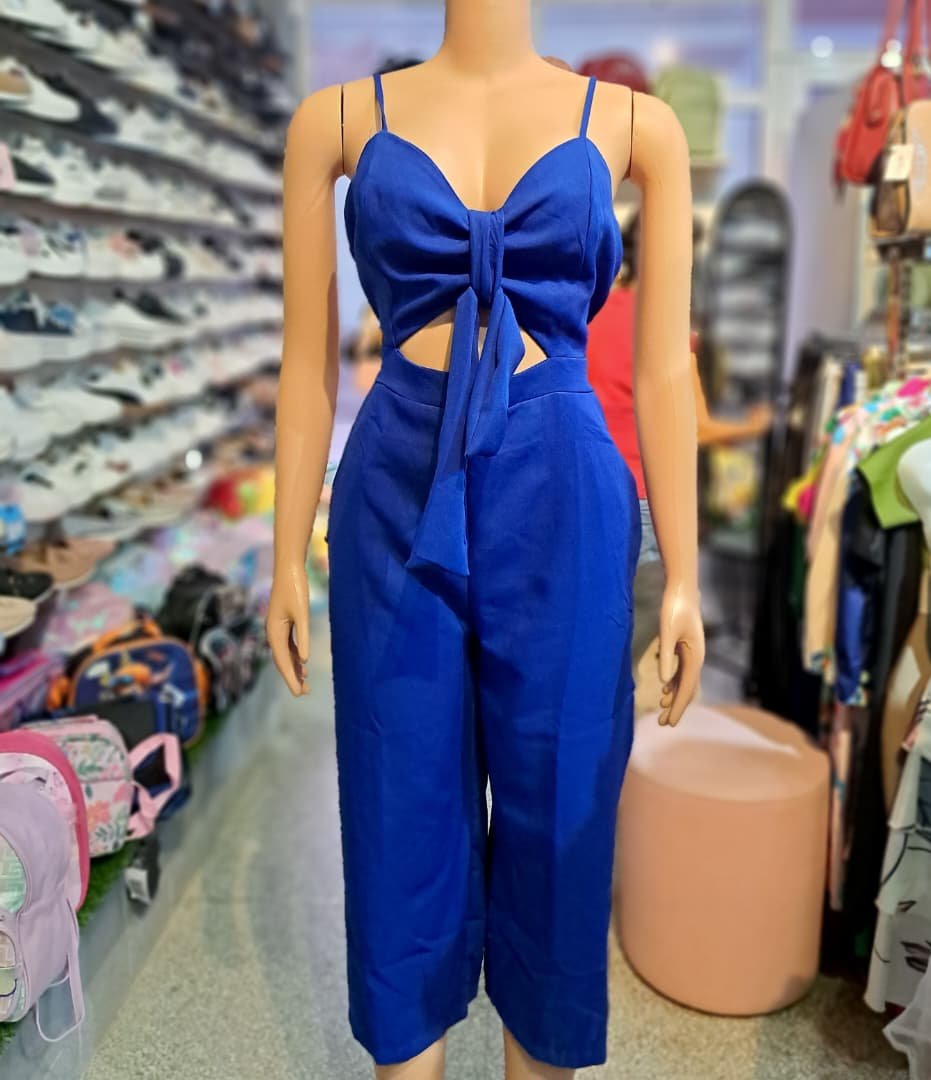 Enterizo azul presenta un diseño con aberturas y un detalle de nudo en el frenteEnterizo azul presenta un diseño con aberturas y un detalle de nudo en el frente