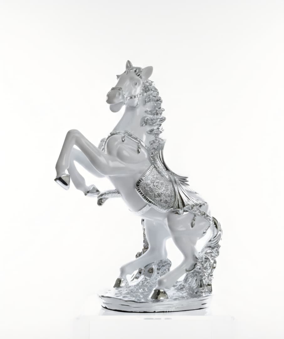 Figura coleccionable que representa a un caballo encabritado con detalles en color blanco y plataFigura coleccionable que representa a un caballo encabritado con detalles en color blanco y plata