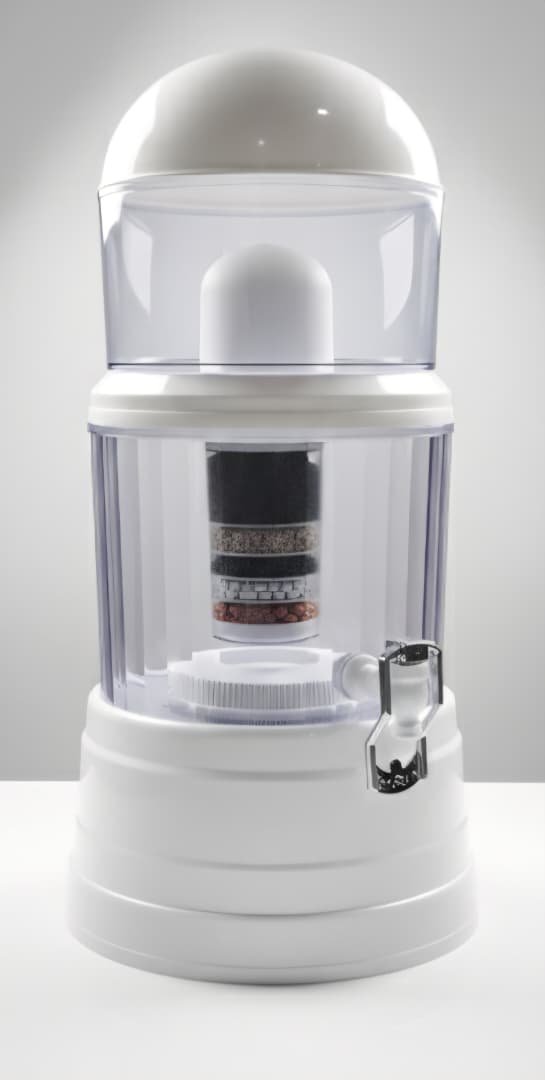 Filtro purificador de agua por gravedad de encimera de capacidades como 14 litros.