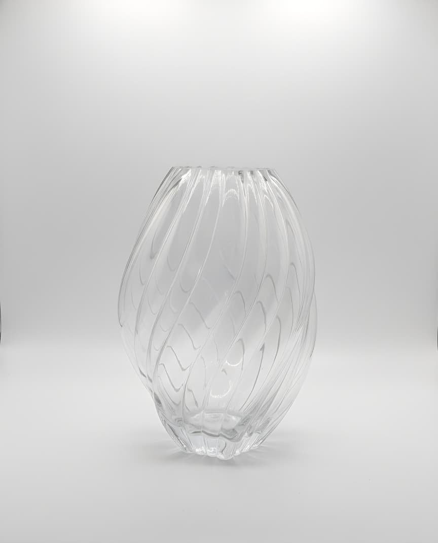 Florero de cristal transparente con un diseño espiral.