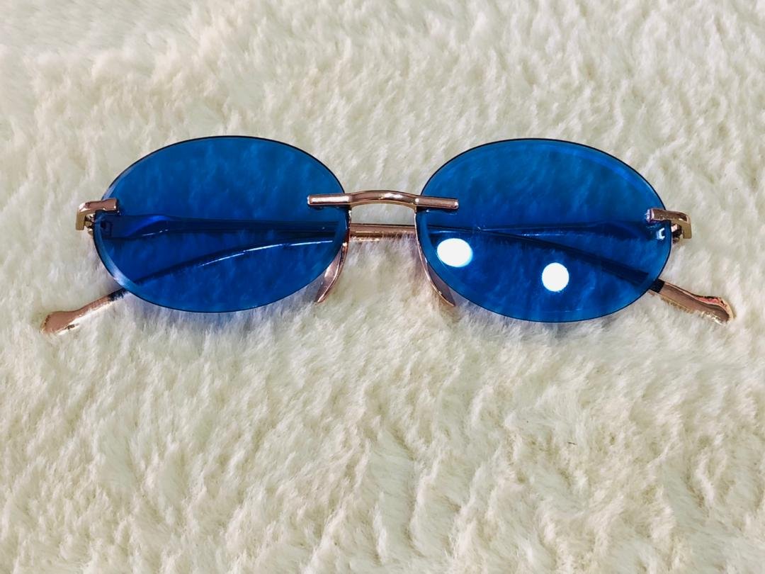sdGafas de sol de estilo «Morpheus» con lentes ovaladas azules sin montura y una estructura metálica dorada.xc
