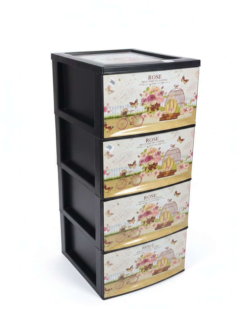 Gavetero organizador de 4 niveles fabricado en plástico, con un diseño decorativo floral estilo «Sweet Home» en los cajones.