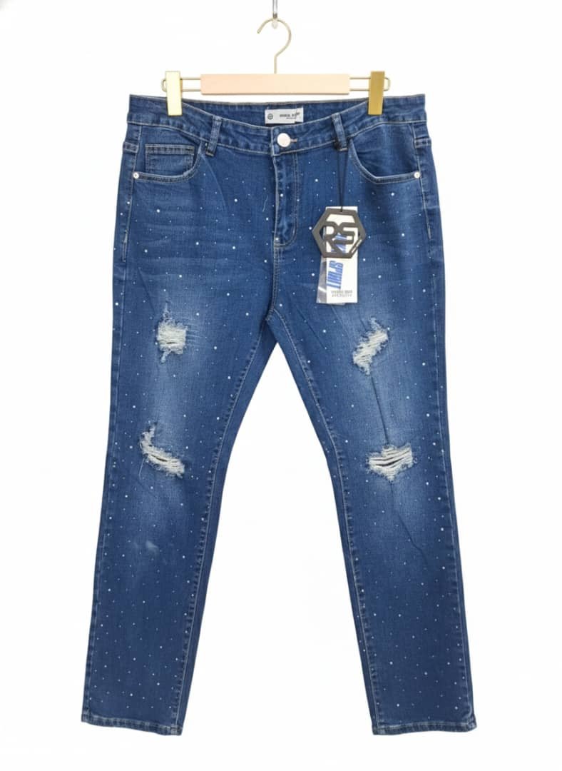 Jeans de mujer decorados con cristales y diseño desgastado con roturas.