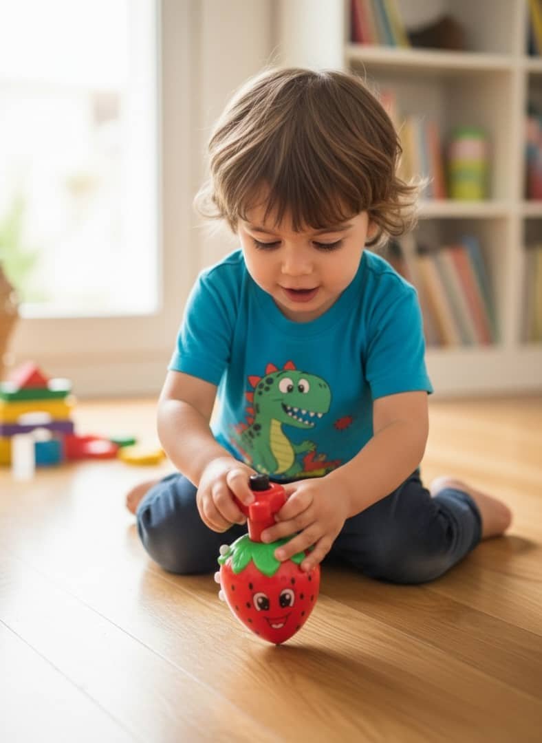 / Juguete musical giratorio en forma de fresa. Con cuerda y luces,