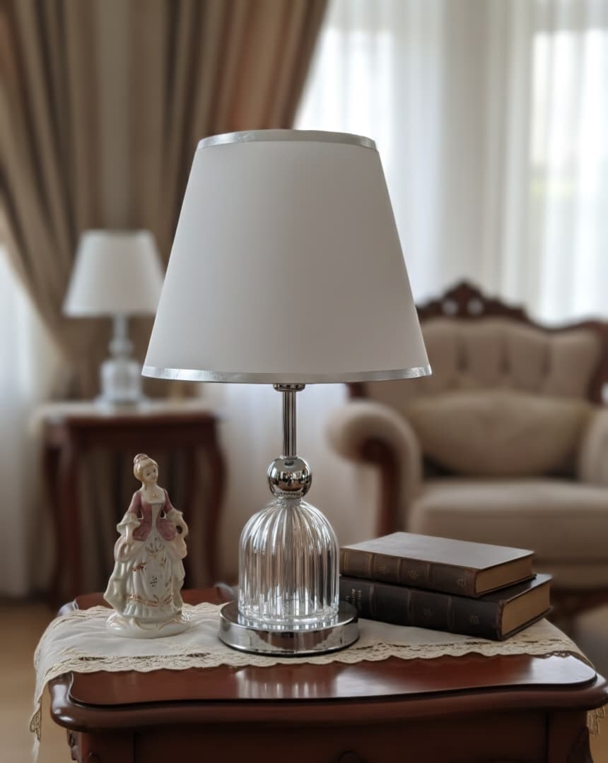 Lámpara de mesa de cristal y metal plateado con una pantalla blanca.