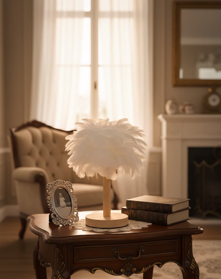 Lámpara de mesa de plumas blanca con base de madera.