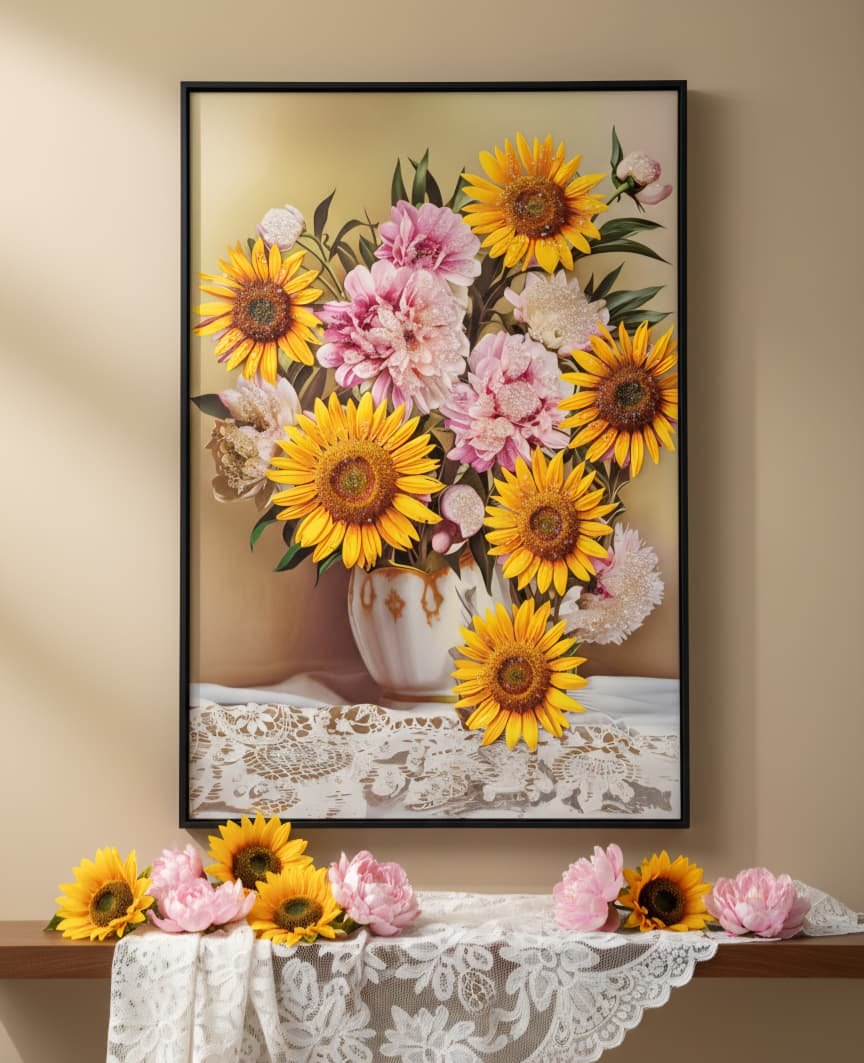 Lámpara de mesa con base de flor de loto y detalles dorados.