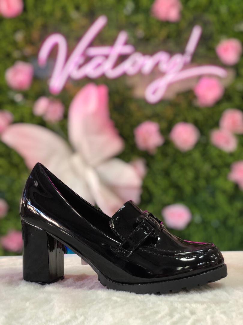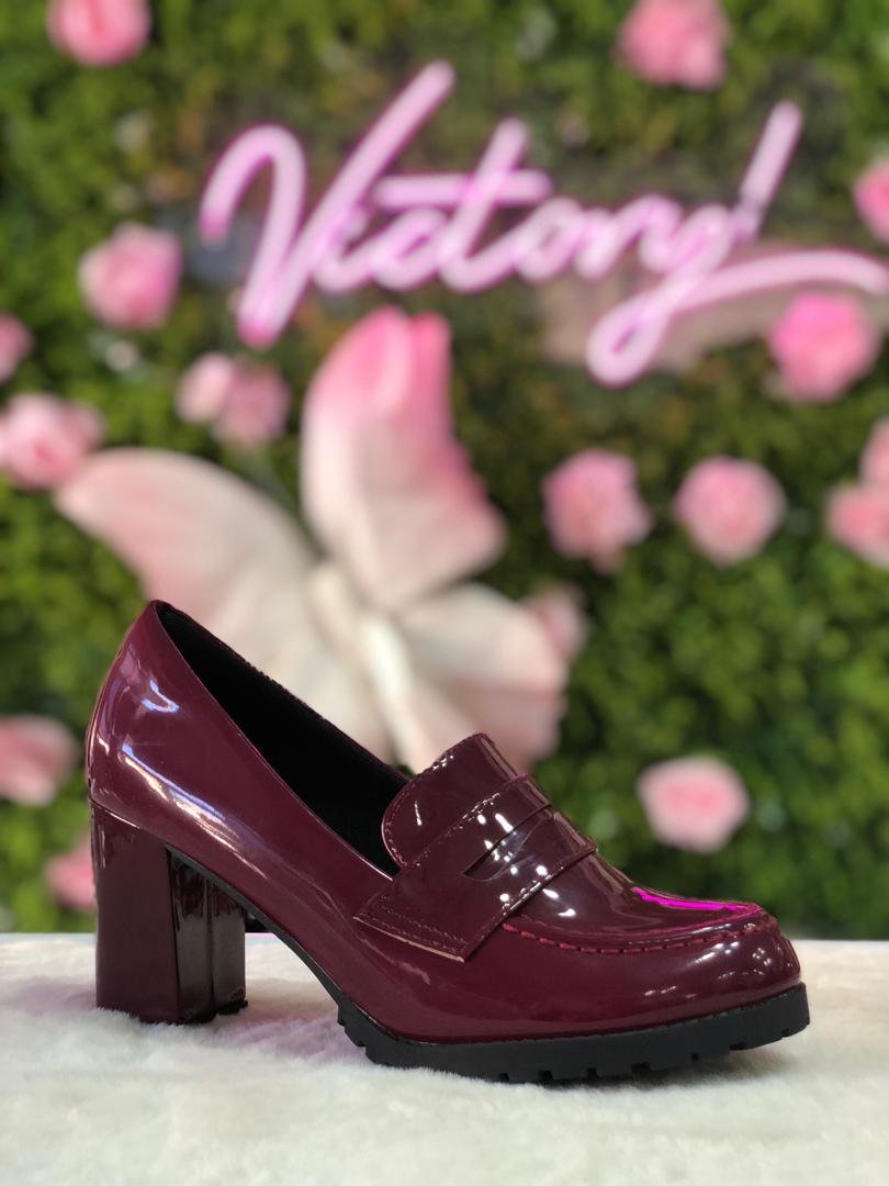 / Mocasines de tacón en color vino con acabado de charol alto brillo.