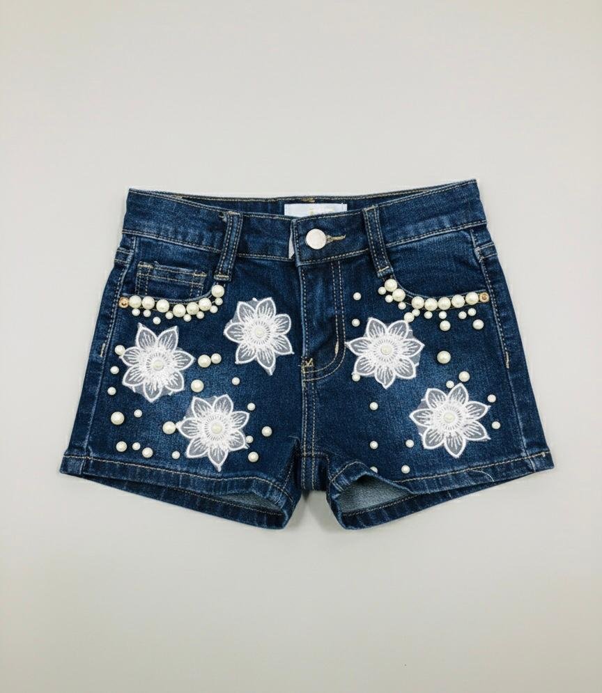 Pantalones cortos de mezclilla para niñas decorados con apliques florales y perlas.