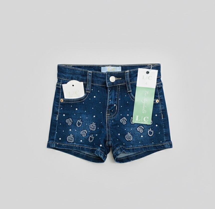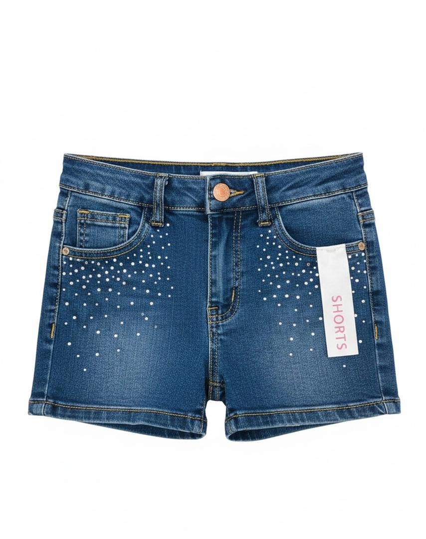 / Pantalones cortos de mezclilla para niñas decorados con apliques florales y perlas.