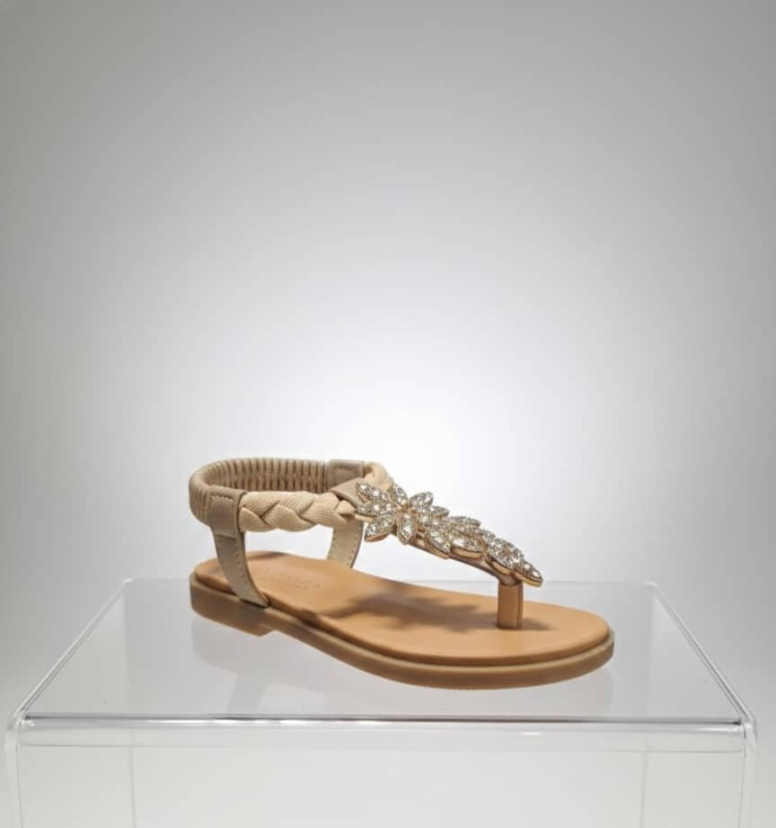 Sandalia plana estilo chancla para mujer con tira decorada con cristales y banda elástica en el talón.Sandalia plana estilo chancla para mujer con tira decorada con cristales y banda elástica en el talón.