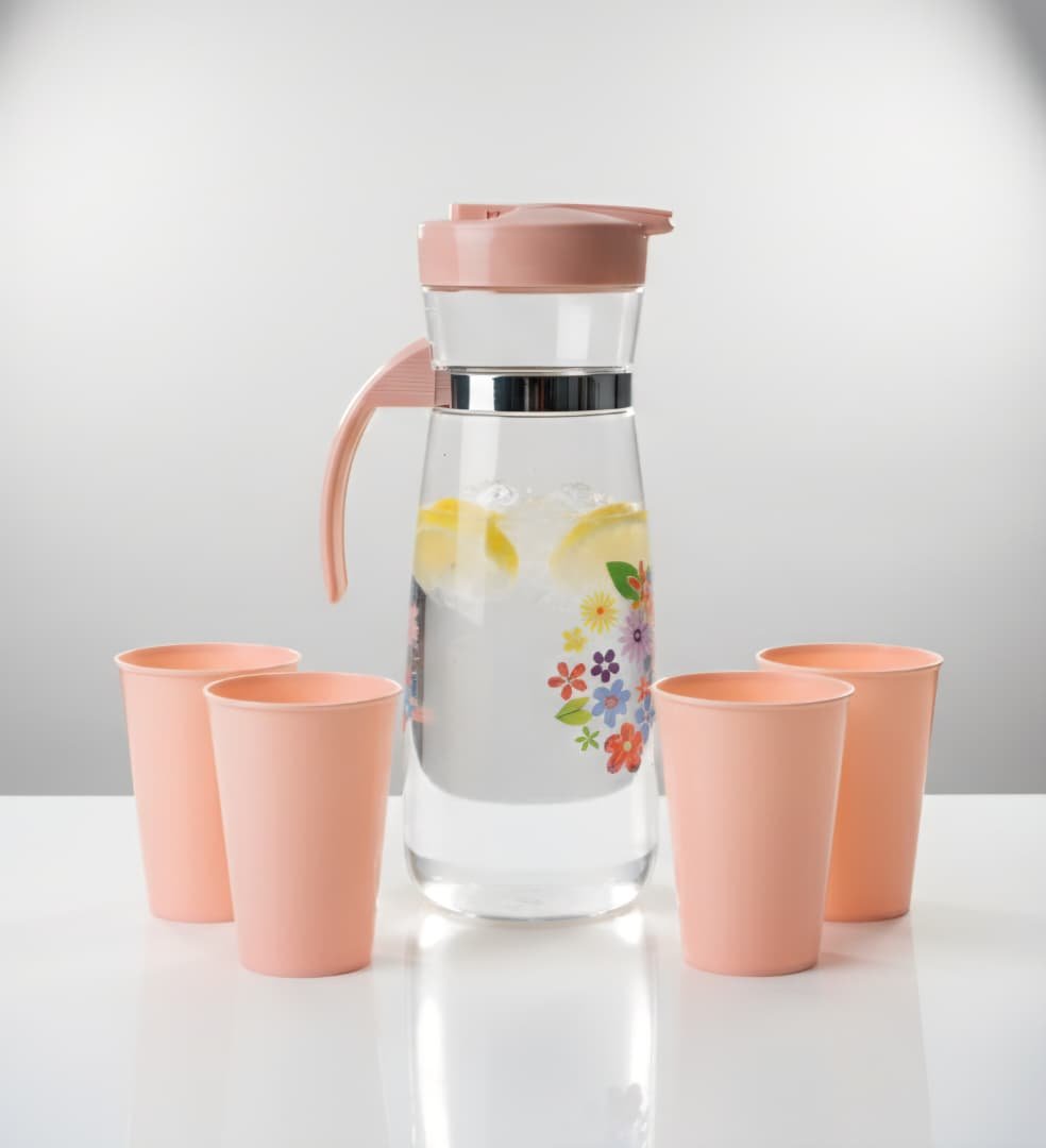 Set de una jarra de vidrio con diseño floral y cuatro vasos de plástico en color rosa melocotón.