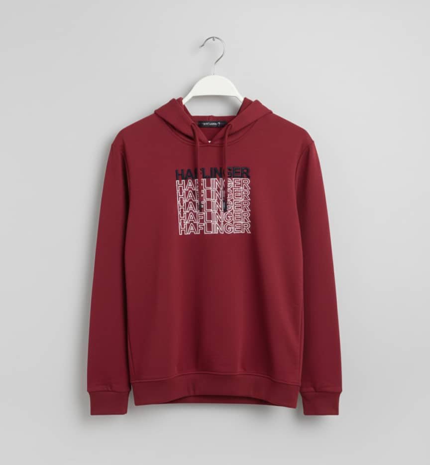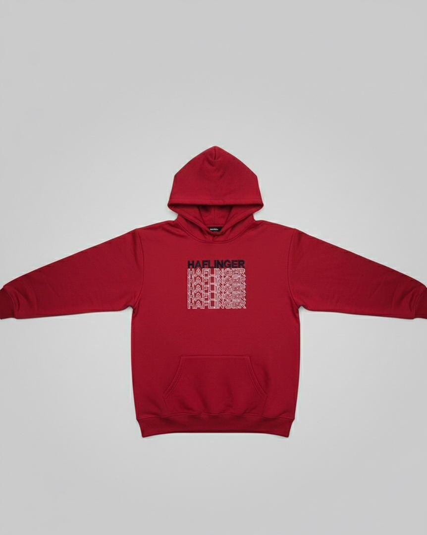 Sudadera con capucha de color rojo vino con un gráfico de texto bordado en el pecho.Sudadera con capucha de color rojo vino con un gráfico de texto bordado en el pecho.