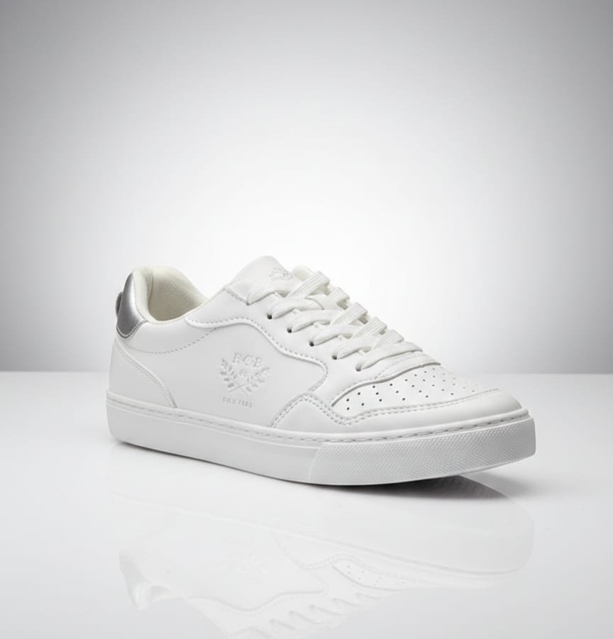 Zapatilla de deporte casual para mujer de color blanco con detalles plateados en el talón