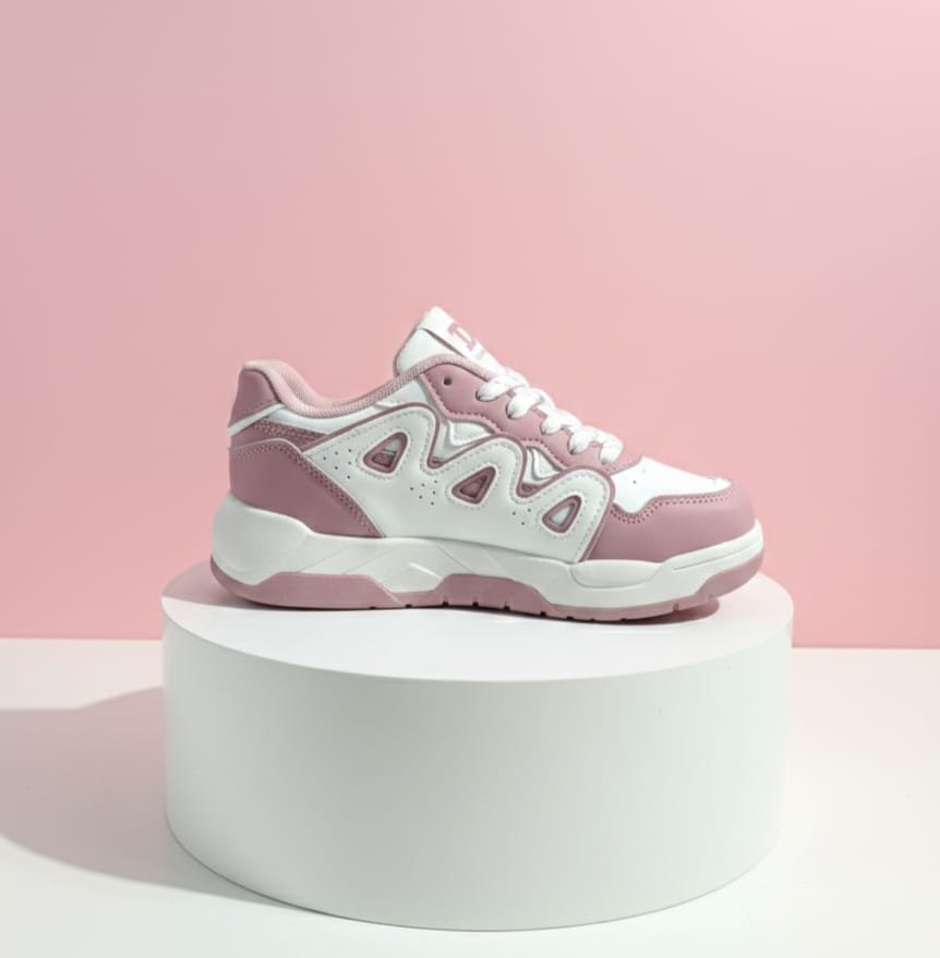 / Tenis deportivos para mujer presentan un diseño de moda con una combinación de colores blanco y rosa.