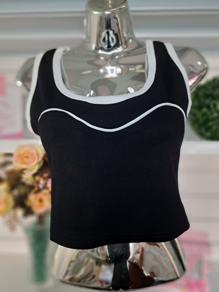 / Top corto negro con bordes blancos, diseñado con un estilo deportivo y elástico