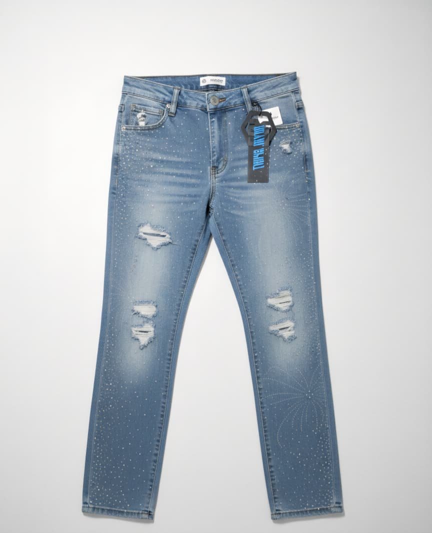 Vaqueros de mujer, modelo Ana Fab Ab con tiro alto, corte acampanado, diseño rasgado y detalles de pedrería.Vaqueros de mujer, modelo Ana Fab Ab con tiro alto, corte acampanado, diseño rasgado y detalles de pedrería.