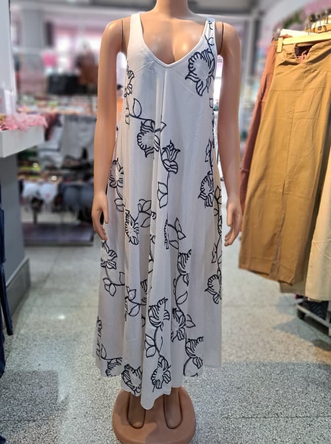 / Vestido largo blanco de tirantes con un diseño estampado de flores negras, ideal para un estilo casual y veraniego.