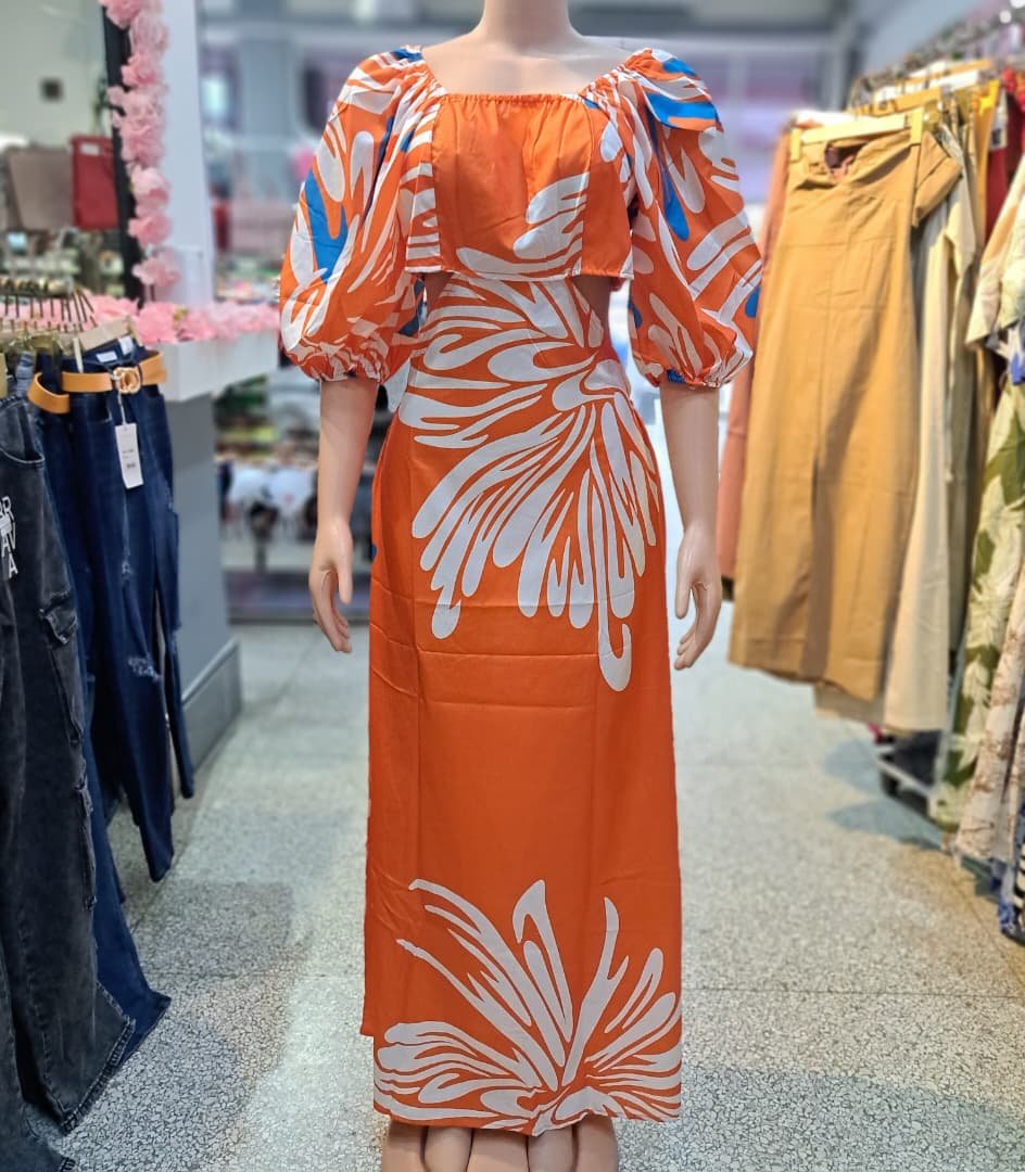 / Vestido largo de color naranja con estampado tropical y mangas abullonadas, ideal para un estilo fresco y femenino