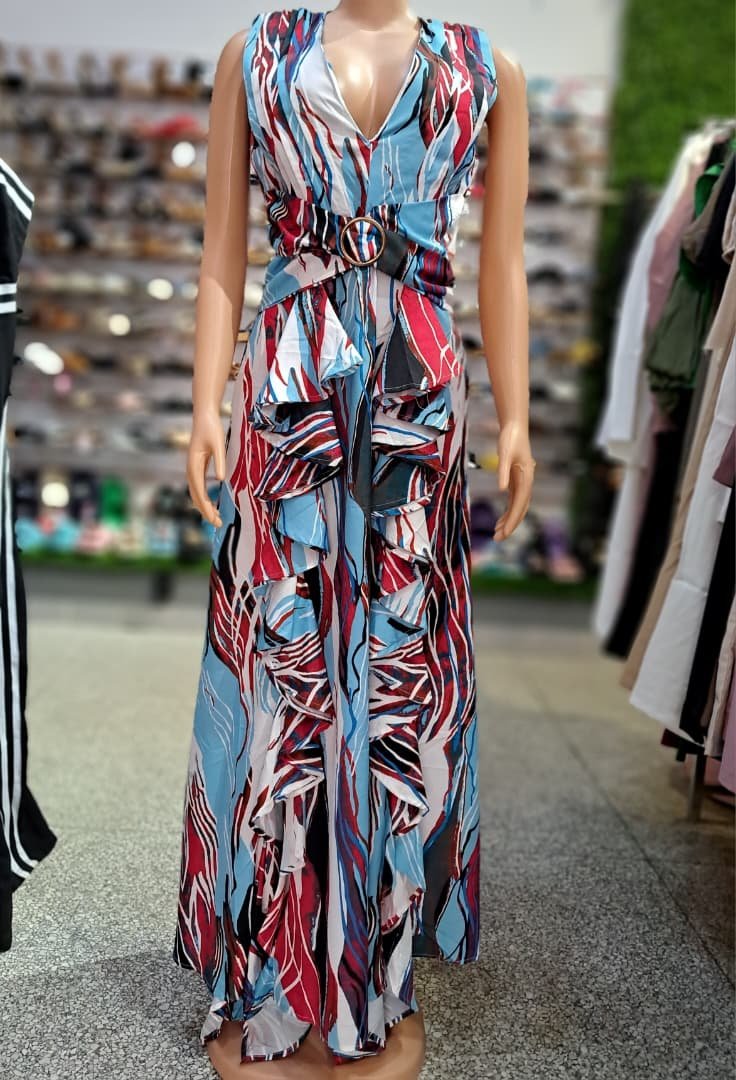Vestido largo de mujer con estampado abstracto, escote en V y volantes frontales.Vestido largo de mujer con estampado abstracto, escote en V y volantes frontales.